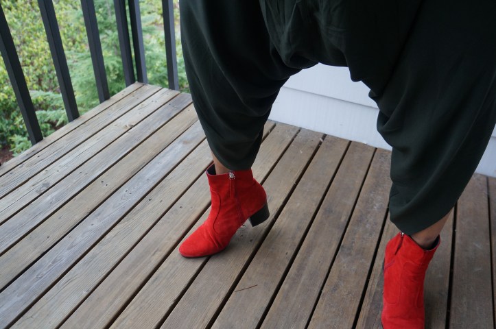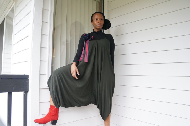Despite the never-ending nip in the air, I was determined to wear the jumpsuit, with its irresistible sagging drop crotch. So I needed to wear something warm underneath that didn’t add bulk to an already voluminous article, something that stuck to the body and stayed there. So small sips and crossed legs it was.