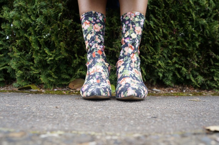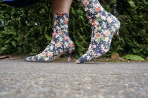 Then… snub the garden party you will not be invited to, you minx, by donning floral socks with heels attached.